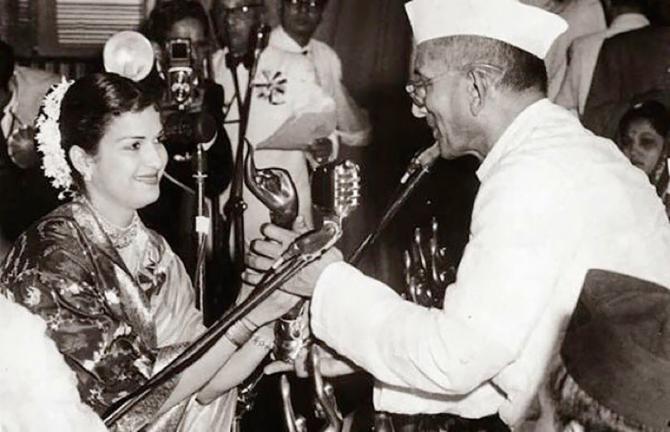 BEELD: Kamini Kaushal ontvangt de Filmfare Best Actress Award voor Biraj Bahu door Morarji Desai, de toenmalige eerste minister van Maharashtra in 1956. Fotografie: Met dank aan Filmgeschiedenis Foto’s/