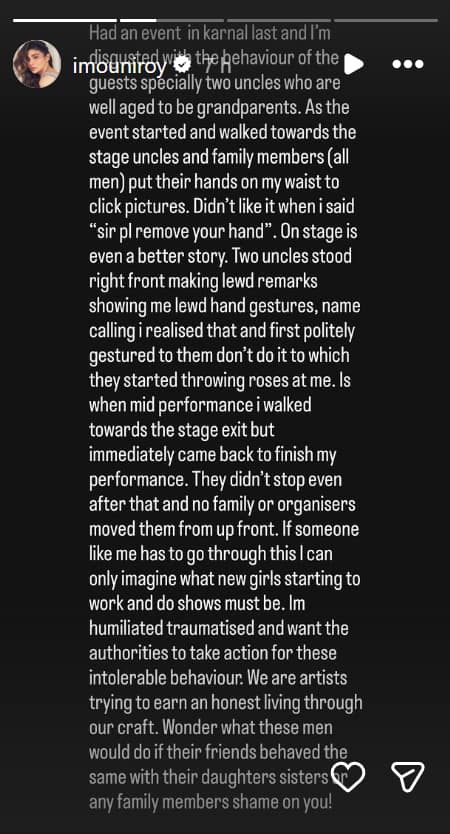 Terwijl ze haar teleurstelling deelde, ging de actrice naar haar Instagram-verhaal en zei: “De laatste keer had ik een evenement in Karnal en ik walg van het gedrag van de gasten, vooral twee ooms die de leeftijd van grootouders hebben. Toen het evenement begon en zij op het podium kwamen, legden ooms en familieleden (allemaal mannen) hun handen op mijn middel om op foto’s te klikken. Ik vond het niet leuk toen ik zei: ‘Meneer, verwijder alstublieft uw hand.'” Op het podium is er een nog beter verhaal. Twee ooms stonden vlak voor me en maakten obscene opmerkingen met obscene handgebaren en beledigingen. Ik besefte dit en gaf ze eerst een beleefd sein om dat niet te doen, waarop ze rozen naar me begonnen te gooien.