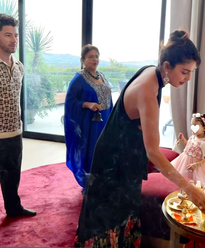 Priyanka’s moeder Madhu Chopra viert feest met hen.