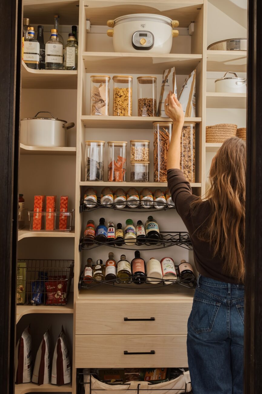 Ik groepeer items losjes per categorie en concentreer me vervolgens op zichtbaarheid: doorzichtige bakken, open bakken en opslagsystemen die in één oogopslag werken. Geloof me: ik prijs niet alles. Het gaat meer om het creëren van een voorraadkast die weerspiegelt hoe ik dag in dag uit kook (en snack!)
