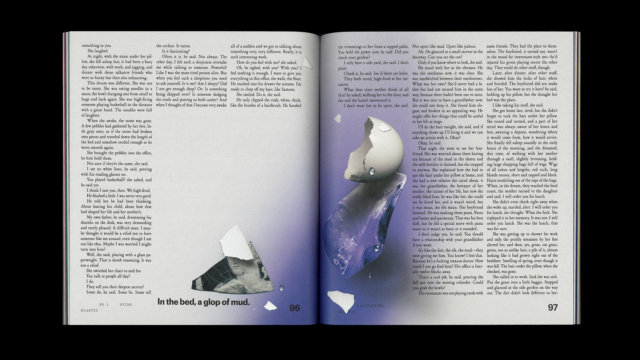 Elastischzoals beschreven in de brief van Hillary’s redacteur, is hij geïnteresseerd in het afbreken van muren. Of beter gezegd, waarmee wordt aangetoond dat de muren nooit echt hebben bestaan. Het tijdschrift brengt de kijker zo dicht mogelijk bij de natuurlijke high, met gebaren van drukfouten (sommige letters herhalend of hele kunstwerken) en kleuren uitgedrukt door heldere ornamenten. Eén pagina toont een tekening in MS-Paint-stijl van een figuur die onder een vuurwerk van kosmische hallucinaties ligt, terwijl een andere pagina een eenvoudig ei zal hebben. “Elastisch’De samenvatting van vandaag is plakkerig, strekt zich uit over interstitials en wordt keer op keer herhaald – in zekere zin bestaat het in de tijd. Op deze pagina’s begint het tijdschrift letterlijk uit elkaar te vallen, onleesbaar en interpretatief te worden”, zegt Chloe. “De interstitials zijn cruciaal om ervoor te zorgen dat het lezen van het tijdschrift van begin tot eind een psychedelische ervaring op zich wordt.”