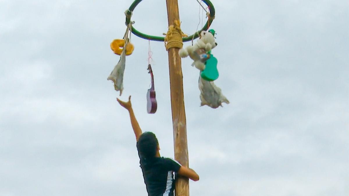 Naarmate hij verder gaat Spelletjes voor kinderen serieDe in België geboren en in Mexico wonende kunstenaar Francis Alÿs documenteert de verschillende spellen die kinderen over de hele wereld spelen. In deze aflevering van Avintes in Portugal leg je een groep tieners vast die een spel spelen dat bekend staat als Ik talg pau – wat zich vrij vertaalt als ‘meiboom’ – waarin, nogal toepasselijk, deelnemers proberen een met vet bedekte houten paal te beklimmen om de prijzen op te eisen die aan de bovenkant hangen. Hier hangen kabeljauw, een teddybeer en kleine gitaren aan een ring aan de top en blijven frustrerend buiten het bereik van de meeste spelers hangen totdat ze samenwerken en een strategie bedenken om hun gemeenschappelijke tegenstanders te overwinnen: gladheid en zwaartekracht. De scène, gefilmd in een observerende stijl, is speels hilarisch en wijst tegelijkertijd op iets diepzinnigs over hoe spelen en leren elkaar kunnen informeren.