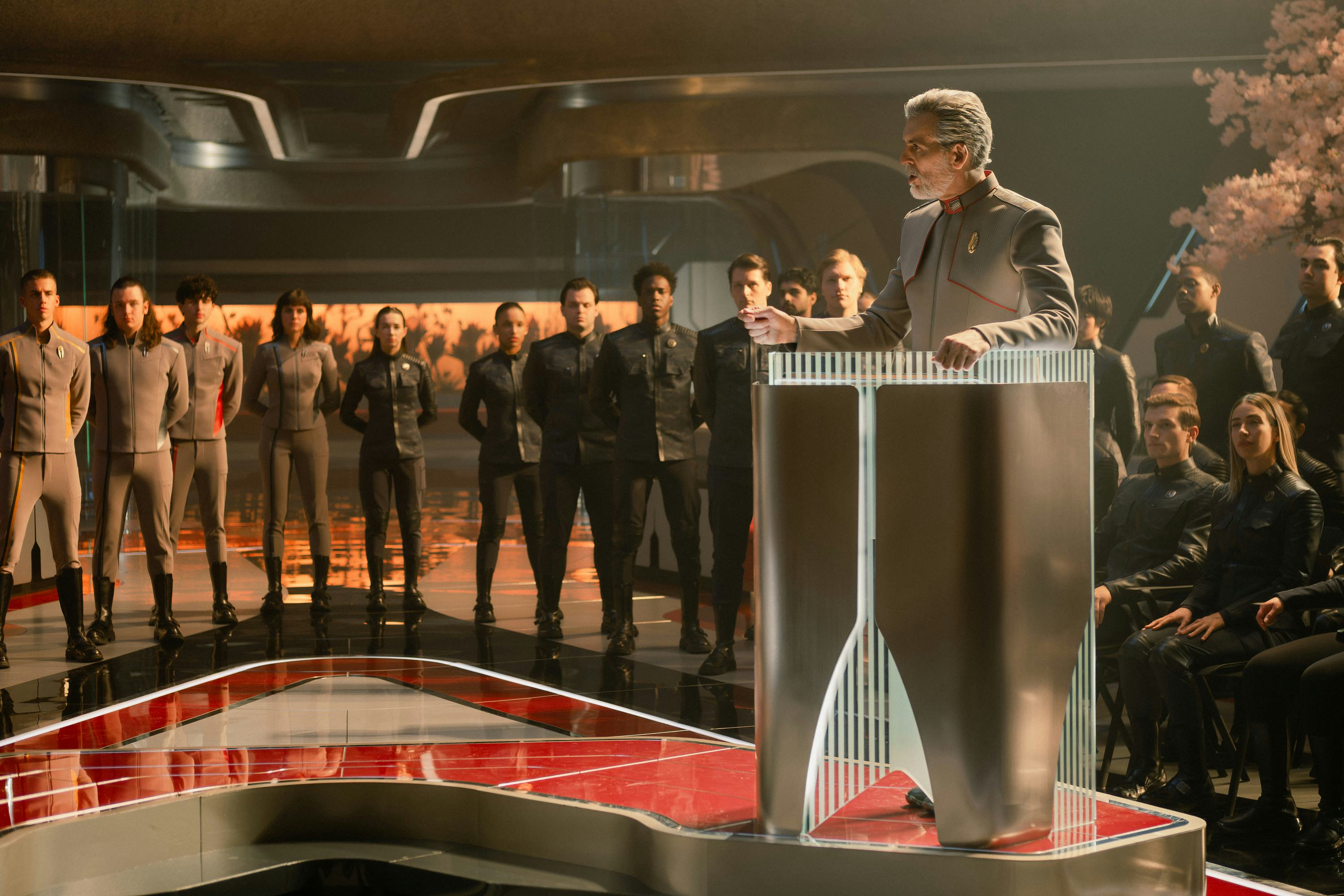 “Ik denk dat het voor Vance zijn droom is om terug te gaan naar de tijd vóór de brand, om Starfleet weer op verkenning te brengen”, zegt Fehr. “Het is dus een droom die uitkomt om de Starfleet Academy te openen en Nahla (Holly Hunter) de kanselier voor hem te laten zijn.”