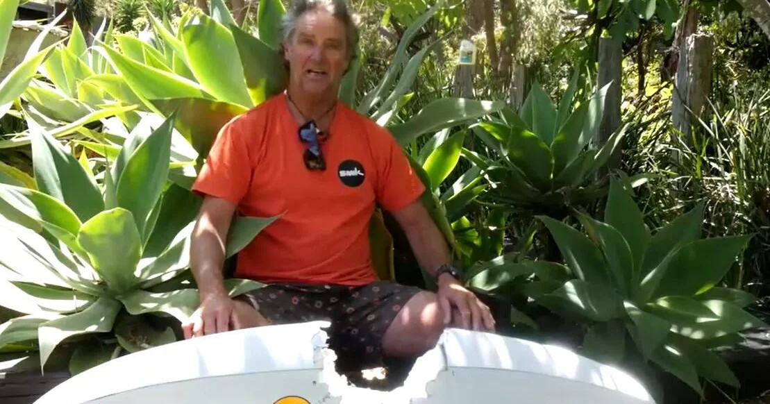 Ongeveer 10 seconden nadat hij onder water is getrokken, met wat spatten op zijn plaats, zie je McDonald weer bovenkomen in de zwelnetvideo. Terwijl hij met ABC sprak, zat hij achter zijn surfplank, die aan de zijkant een opvallende, hapvormige ruimte had van ongeveer 30 cm breed.