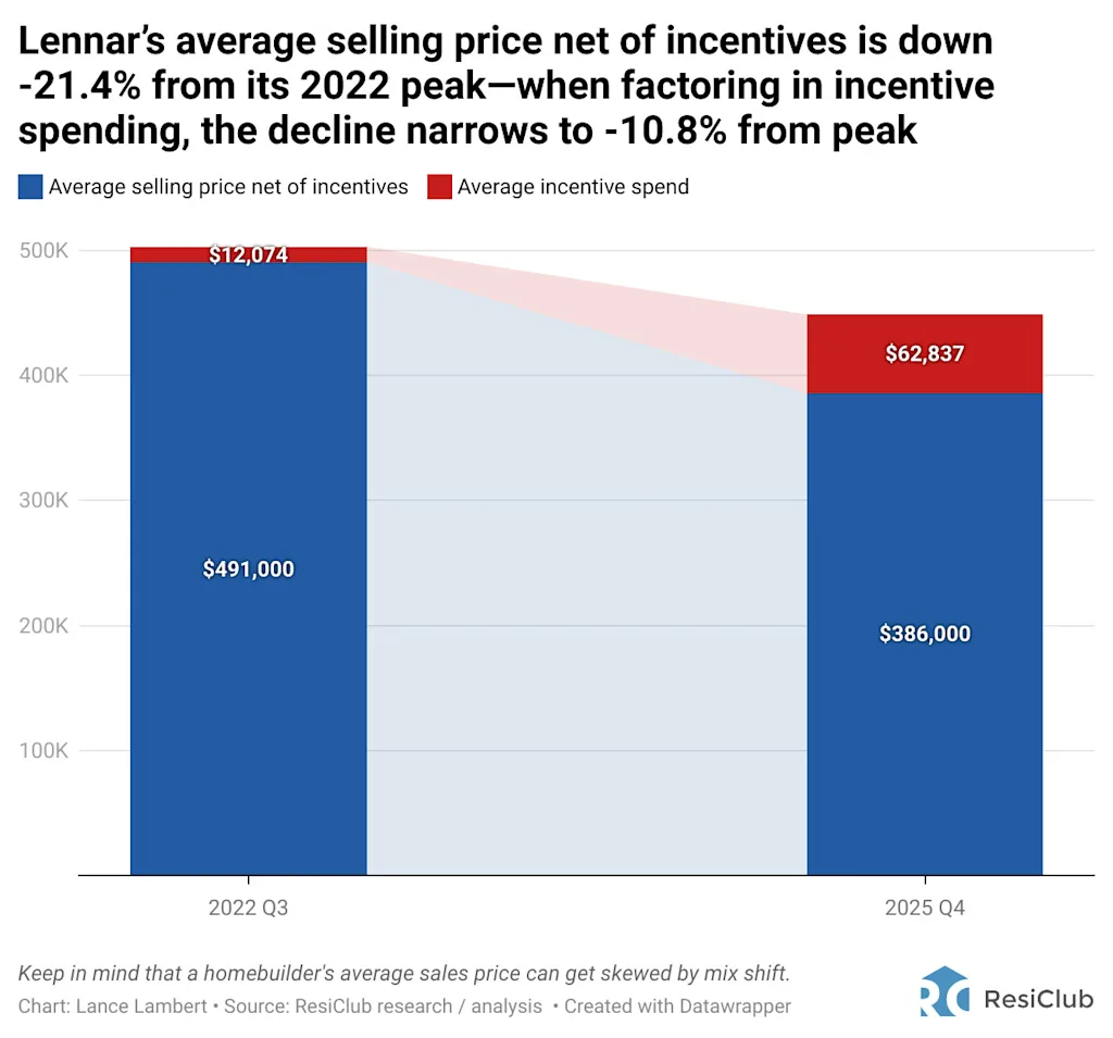 Rekening houdend met de stimuleringsuitgaven betaalde de typische huizenkoper van Lennar in het derde kwartaal van 2022 ongeveer $ 503.074. In het vierde kwartaal van 2025 betaalde de typische huizenkoper in Lennar ongeveer $448.690, ongeveer 10,8% minder dan in het derde kwartaal van 2022, dat het topkwartaal voor Lennar markeerde.