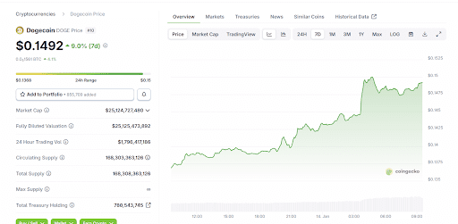 Dogemoneta blijft in de schijnwerpers staan ​​nu institutionele nieuwsgierigheid zich ontwikkelt rond door meme aangedreven activa. De hype rond de Dogecoin ETF heeft ertoe bijgedragen dat de aandelen stabiel zijn gebleven, waarbij Dogecoin op het moment van schrijven rond de $ 0,15 schommelde. De afgelopen 24 uur schommelde de prijs tussen $0,145 op het laagste punt en rond $0,156 op het hoogste punt. Het handelsvolume bleef stabiel, als gevolg van de aanhoudende deelname van detailhandelaren en kortetermijnfondsen. Het ETF-verhaal zorgde voor legitimiteit en zichtbaarheid, maar het koersgedrag bleef eerder beheerst dan explosief.