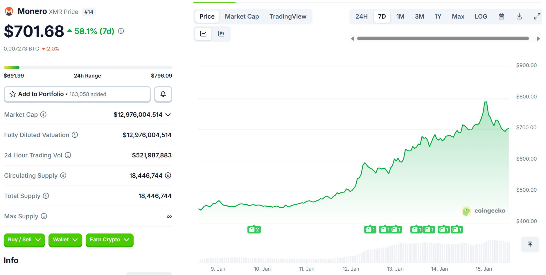 DE Monero (XMR)-prijsstijging. is sterk gebleven, waarbij XMR in de laatste periode rond de $705 handelde. Het dagelijkse volume bleef ook hoog, rond de $488-503 miljoen, wat aantoont dat handelaren zelfs na de scherpe beweging nog steeds actief zijn. De marktkapitalisatie van Monero bedraagt ​​nu bijna $13,0 miljard, waarmee het op de elfde plaats staat en nog steeds een van de meest gevolgde large-cap-munten is.