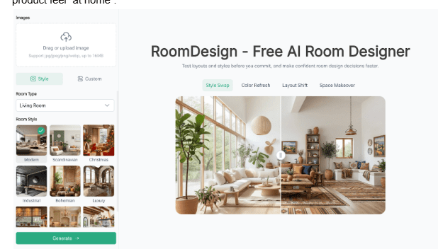 Sommige categorieën verkopen beter in hun context, vooral huishoudelijke artikelen, decoratie en meubels. Wanneer de setting van de kamer belangrijk is, komt RoomDesign goed van pas. Ontwerp van de kamer richt zich op interieurconcepten en ruimtegerichte beelden, zodat het helpt geloofwaardige omgevingen te creëren waarin een product zich ‘thuis’ voelt.