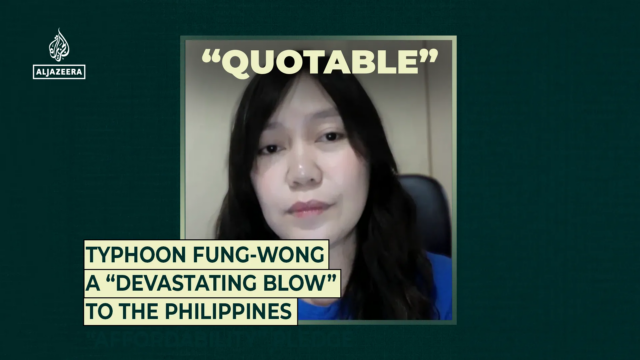 Jessilou Morigo-Tanguilan van Plan International Philippines legt uit hoe tyfoon Fung-wong miljoenen mensen op de Filippijnen heeft getroffen en een pad van vernietiging heeft achtergelaten.