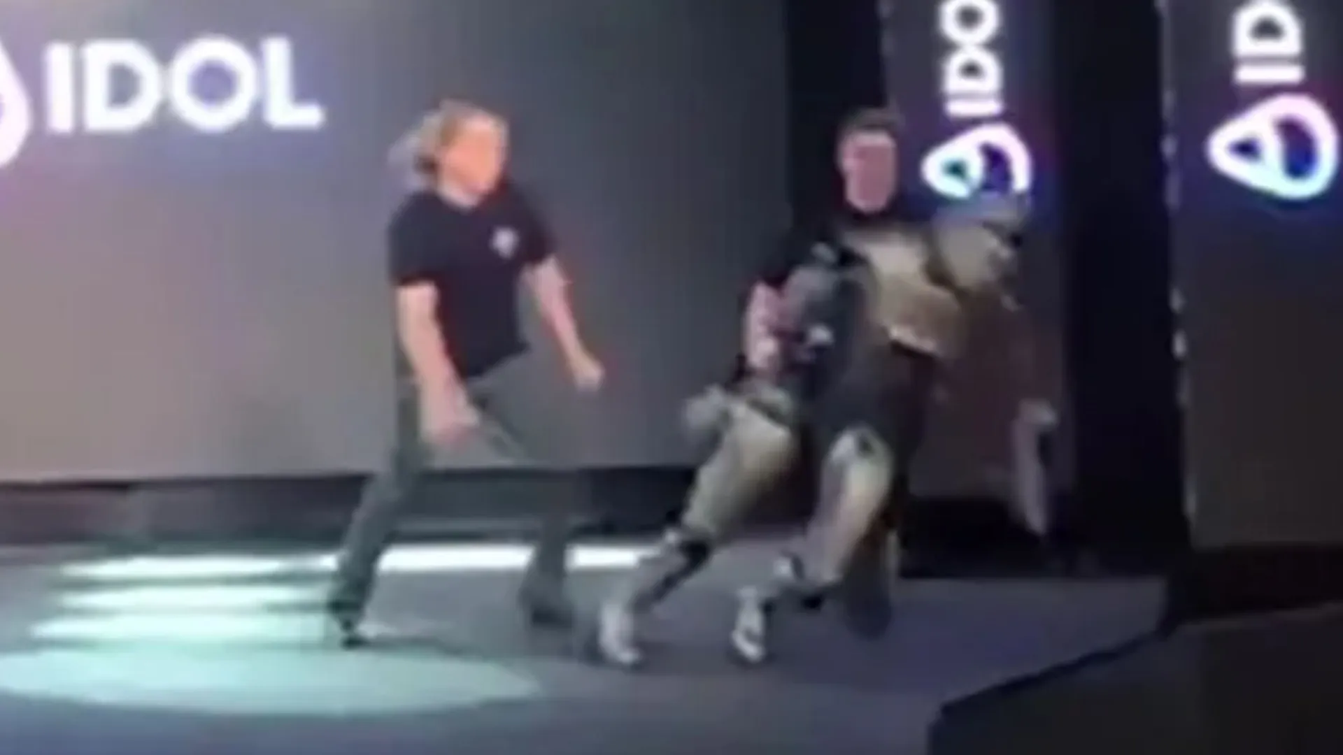 AIdol valt plat op zijn gezicht, terwijl de twee operators zich haasten om het van de vloer te rapen en tientallen mensen hun telefoons tevoorschijn halen om de blunder vast te leggen.